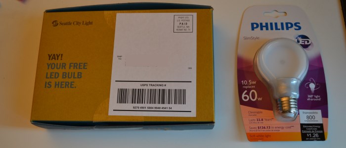 I received this month a coupon for a free LED light. After filling it up and posting it, it took them a week to send it to me. I then received a colorful box with a Philips Slimstyle LED bulb equivalent to a 60 W incandescent…