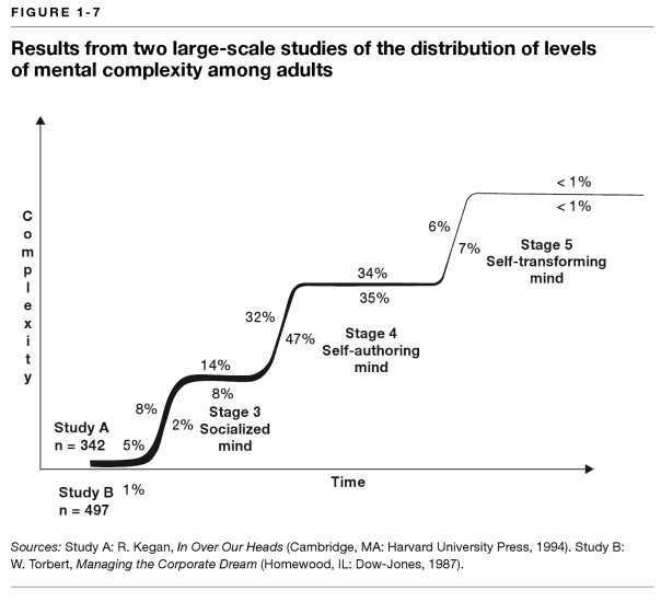 Here is a graph taken from the book that illustrates mental models our their complexity. As you can see, you are probably in Stage 4 : the self authoring mind. The self transforming one is your goal.